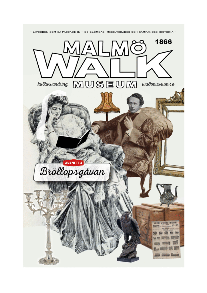 3) Huvudet på Gottfried Kockum är korrekt, dock inplacerat på en skissbilds kropp och soffa. Teckningen är inte av Thekla Fogelklou, inte heller har de olika bröllopsgåvorna någon historisk koppling till paret. Däremot är affischen på Kockums kokspisar som står lutad mot trälådan autentisk.